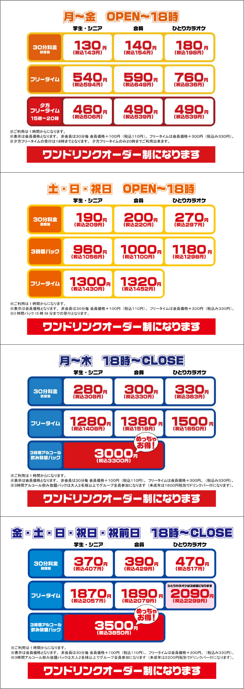 ●ひとりカラオケは学生・シニア割引はありません。