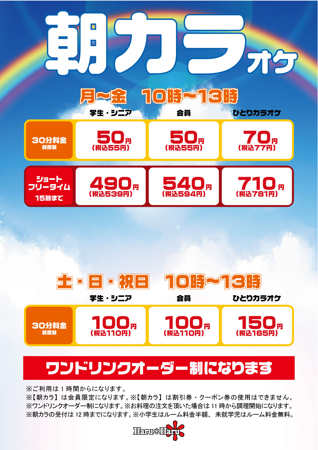 ●ひとりカラオケは学生・シニア割引はありません。